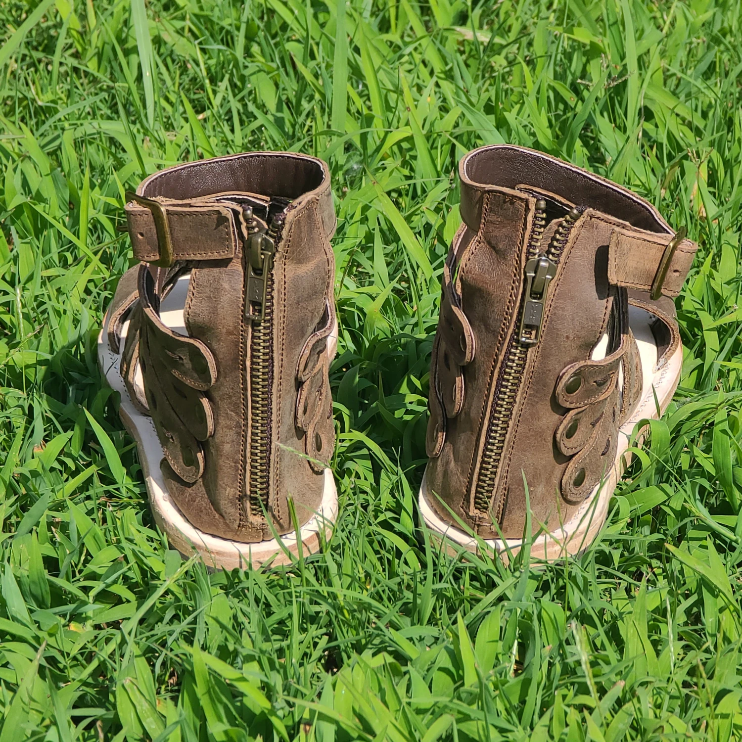 This is such a cute leather sandal. The details in the leather give them a great added touch. They are very easy to put on with the zippers on the back. Wear these with your favorite shorts or skinny jeans.Â