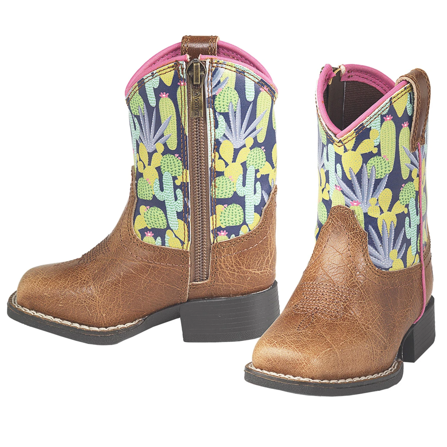 Dress em up in style with these Ariat Lil’ Stompers boot. Genuine leather vamp with a colorful cactus shaft. Leather boot pulls.Â