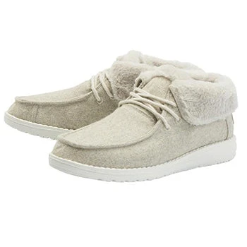 Casual yet stylish that describes the Hey Dude Britt Cream Shoe best! Stay warm as the temps outside drop, with the faux fur lining. These Cream Dudes are perfect as they a pair well with so much.Â