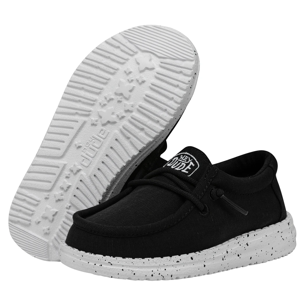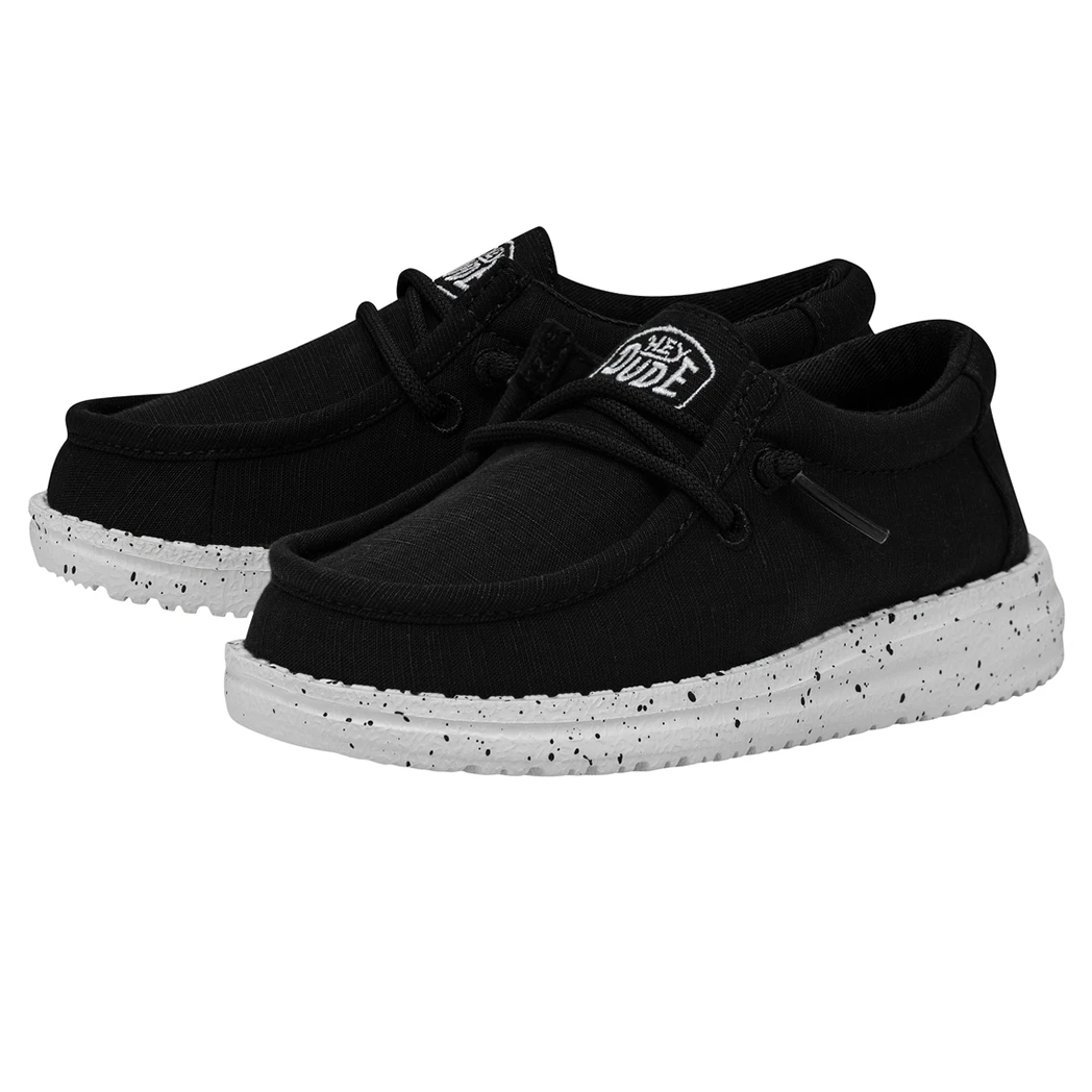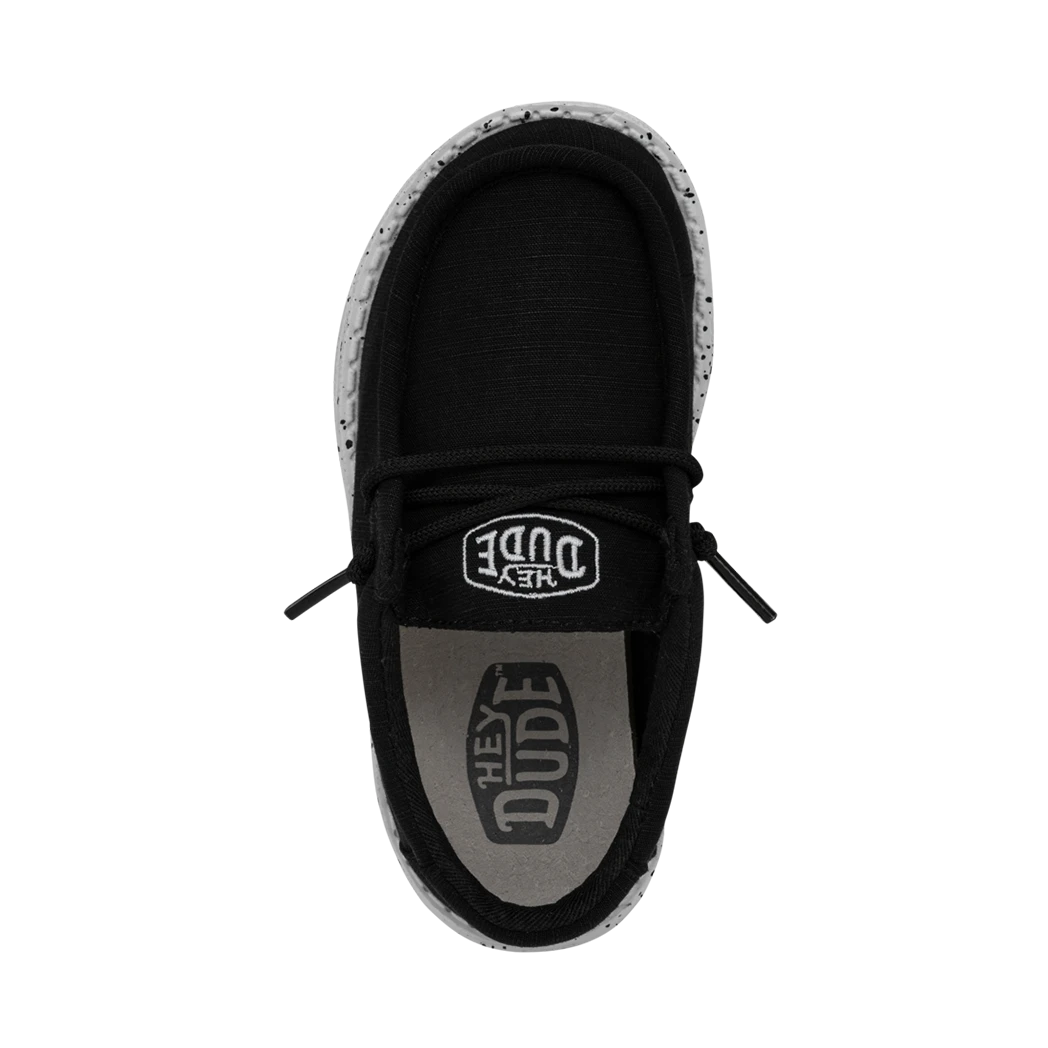 The Wally Toddler Slub Canvas, Black, is the perfect shoe for your little one. The Wally Toddler Slub Canvas collection has all the tried-and-true construction you know and love, but is is extra lightweight for those little ones.  It features a durable slub-woven upper and lined with soft cotton for durability and comfort. This shoe features an ultralight outsole with no-tie, elastic laces and a cushioned ankle collar for extra support. Made just right for spirited little feet.