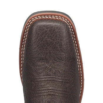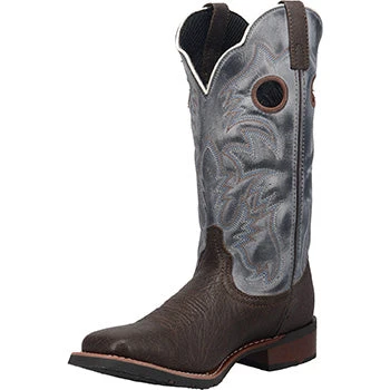 This boot is straight up beautiful with a chocolate leather foot and blue top. The pull-holes make it easy on and off. True cowboy boots with 13″ height and stockman heel.
