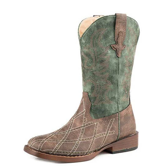 Little Cowkids everywhere will be kickin’ it in style in these brown and green cross-cut diamond stitched square toes from Roper! You’ll appreciate them for their easy-care faux leather construction, and your cowkid will love them for their great looks!